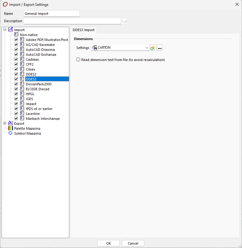 When importing drawings using the DDES3 file format, dimension labels are normally generated based on their calculated size. However, to improve compatibility with other CAD systems, and allow for the preservation of any customer overriden dimension label text, it's possible to enable this option.