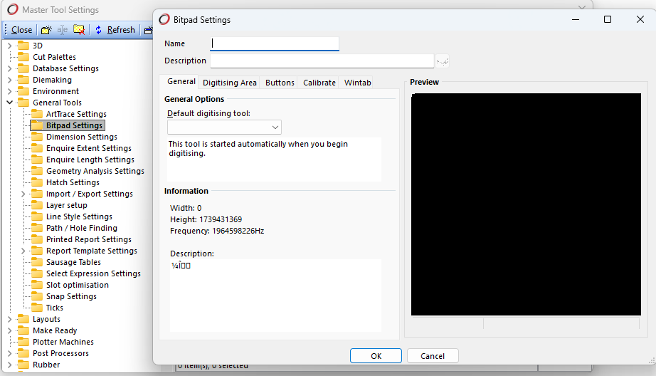 In order to use a digitiser (also called a bitpad, or digitising tablet), you must configure settings for it via the Bitpad Settings. This can be done via Options > Master Tool Settings > General Tools > Bitpad Settings: