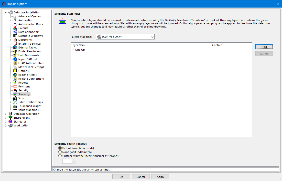 Here, you can define some options for the Similarity Scan tool. These include defining which palettes will be considered for similarity shape profiles and which layers should be searched for profiles. You can also set the search timeout value.